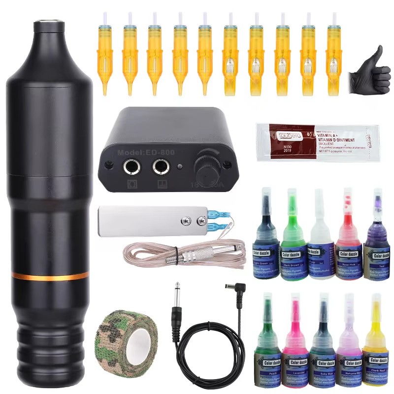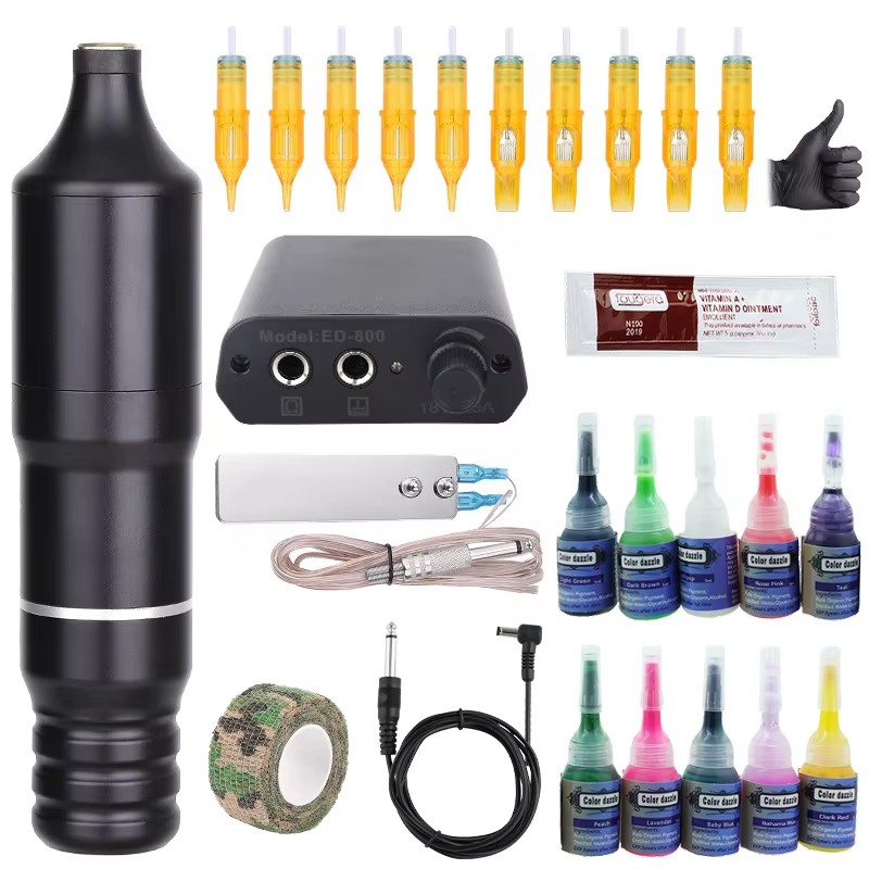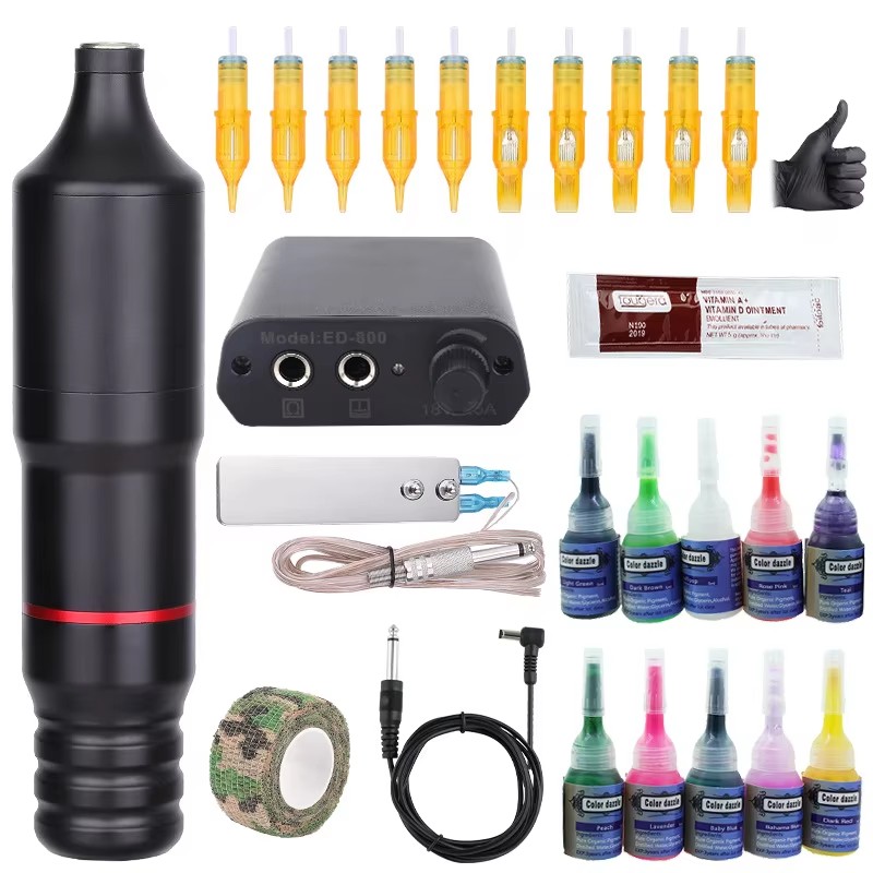 Professional Wireless Battery Complete Tattoo Pen Kit with Cartridge Needles Gloves